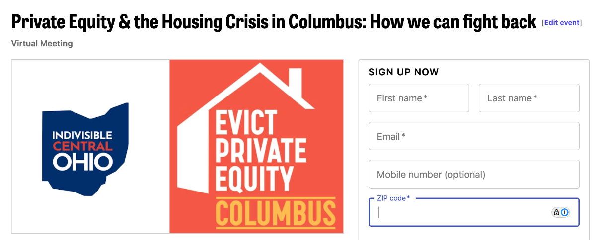 Monday, 9/22/2025: Meeting with Evict Private Equity Central Ohio, 7-8:30pm, virtual. Join ICO to learn more about the campaign by Evict Private Equity Columbus to limit private equity ownership of homes in Columbus and how to help. Register HERE.