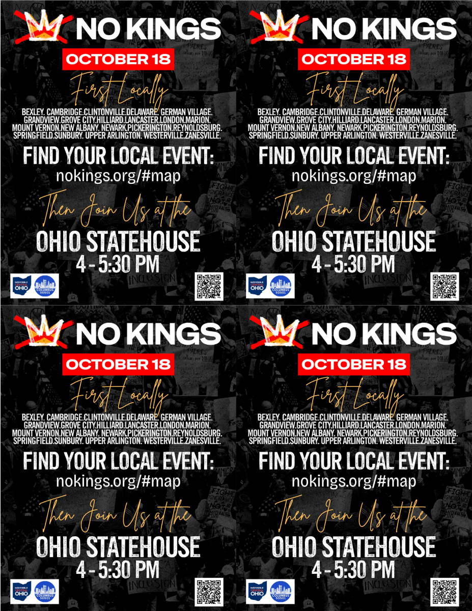 6. Help us spread the word. We will soon have ¼ sheet flyers to hand out about the 10/18 No Kings protests, plus full-size flyers for posting in store windows etc. If you are ready to be part of the flyering army, reply to this email and we’ll get you set up!